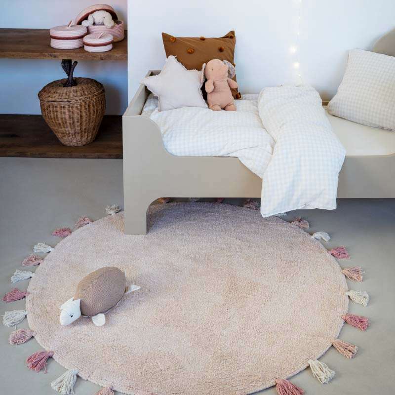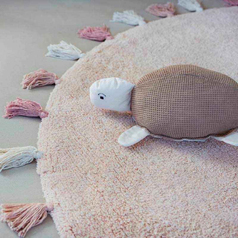לשאוב לפני כביסה במכונה ולקפל את השטיח כלפי פנים.